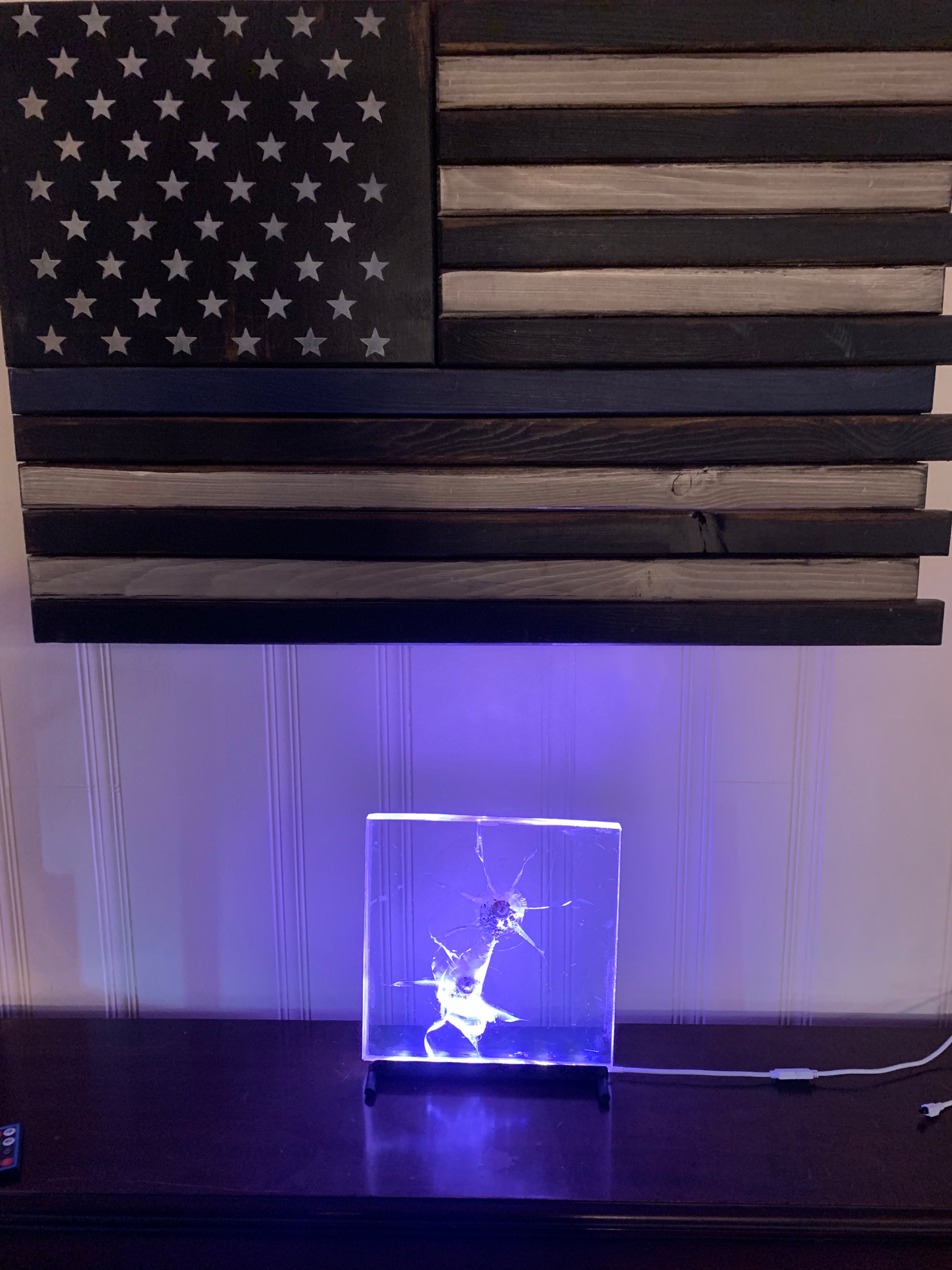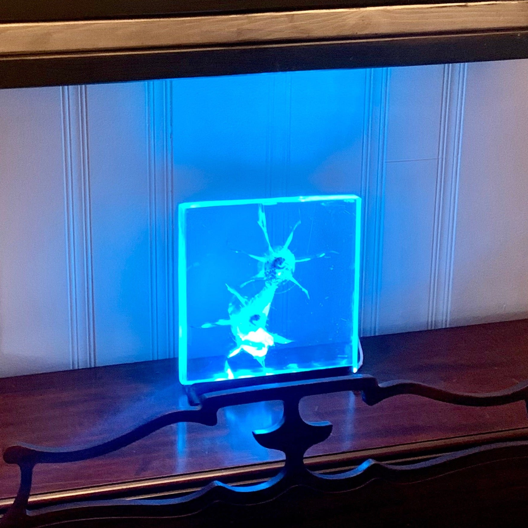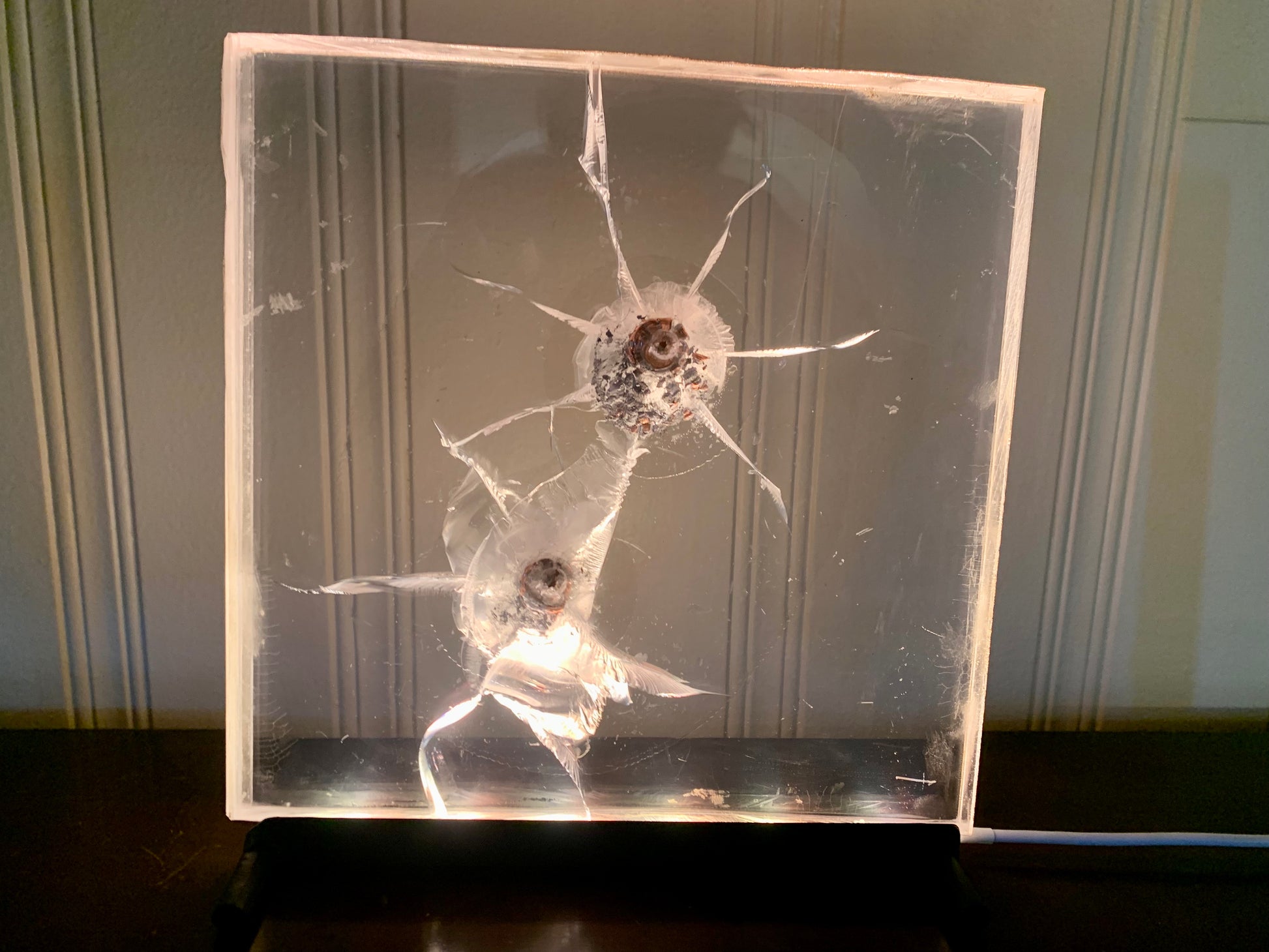 Ballistic Glass piece that was used in testing. Each one is unique, no two displays are the same. This piece was shot with two rounds of 124 gr FMJ 9mm. Contains a stand and LED adjustable lights with remote control.